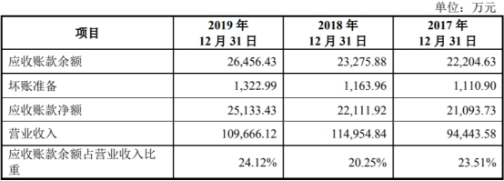 兆龙互连的应收账款飙升。2016年末至2019年末,兆龙互连应收账款余额分别为1.49亿元、2.22亿元、2.33亿元、2.65亿元,占营业收入比重分别为20.95%、23.51%、20.25%、24.12%。