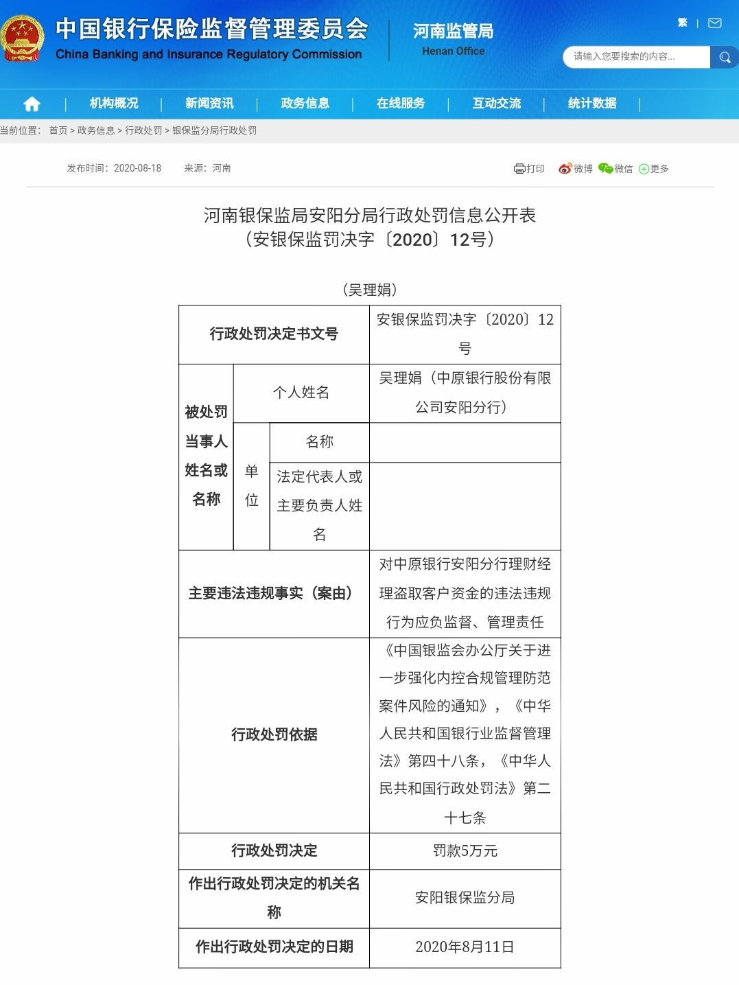 同时,相关责任人吴理娟对中原银行安阳分行理财经理盗取客户资金的违法违规行为应负监督、管理责任,被处罚款5万元。