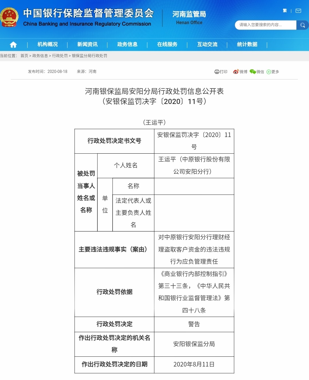 王运平对中原银行安阳分行理财经理盗取客户资金的违法违规行为应负管理责任,受到警告处分。