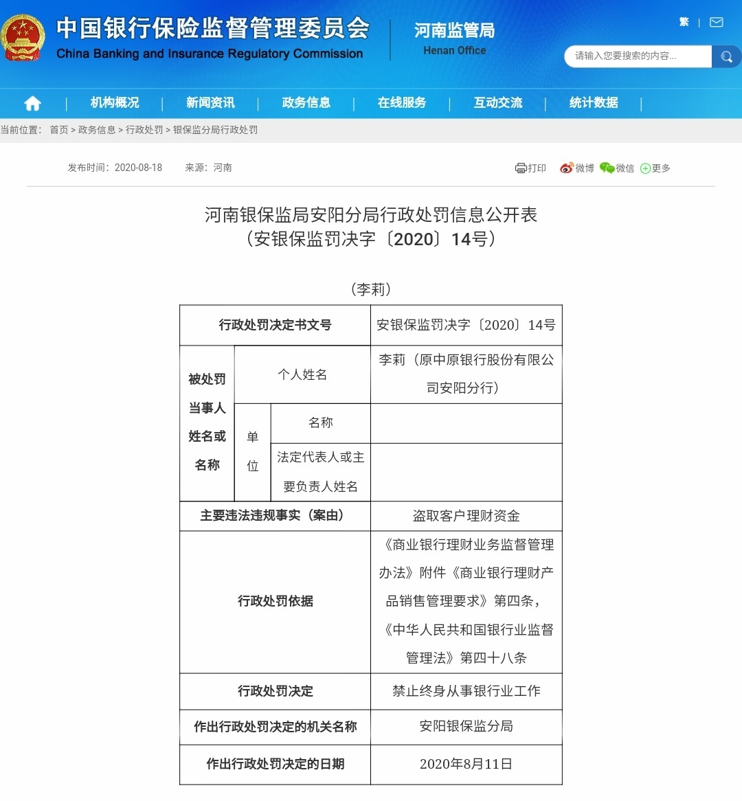 据安阳银保监分局公布的行政处罚信息公开表显示,中原银行股份有限公司安阳分行因理财经理盗取客户理财资金、授权不具有高管资格人员行使高管职权,被处罚款40万元。