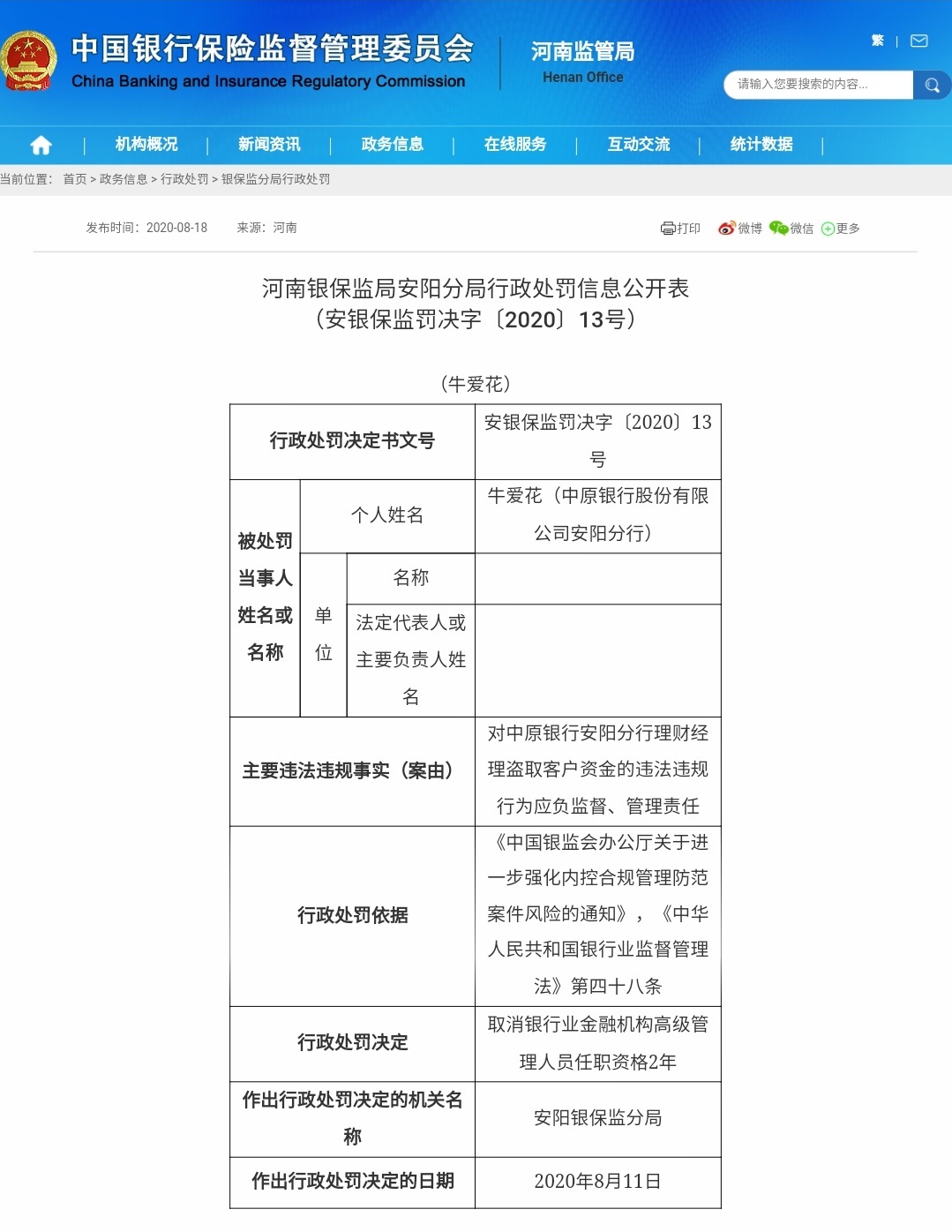 牛爱花对中原银行安阳分行理财经理盗取客户资金的违法违规行为应负监督、管理责任,被取消银行业金融机构高级管理人员任职资格2年。