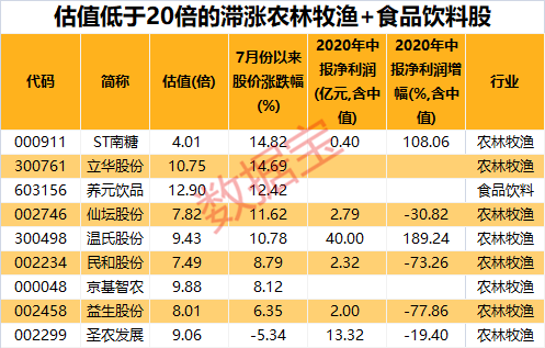 从估值来看,数据宝统计显示,食品饮料、农林牧渔板块中估值低于20倍的有13只,其中好想你、ST南糖、民和股份等8股估值不到10倍,民和股份8月份以来还获得了北上资金加仓,另外估值超10倍但低于20倍的唐人神及立华股份也获得了北上资金加仓。