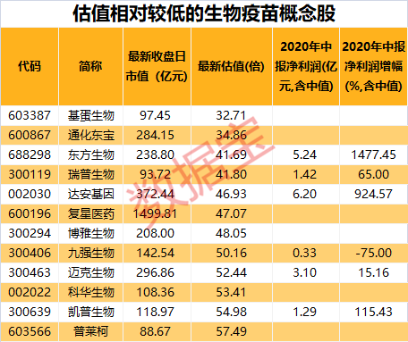 目前,估值低于60倍的生物疫苗股只有12只,相对较低的有基蛋生物、通化东宝、东方生物等7股,最新估值均低于50倍。中报业绩方面来看,这12股中有6股发布中报(预告),除九强生物外,东方生物、瑞普生物、达安基因、迈克生物及凯普生物上半年净利润有望实现增长。其中东方生物上半年净利润增幅接近1500%,达安基因净利润增幅下限超过900%,凯普生物业绩翻倍。
