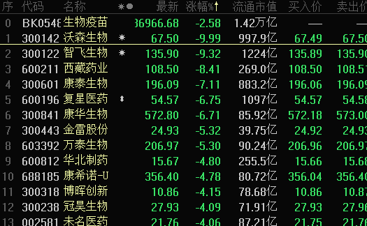不仅仅是保险板块,生物疫苗板块早盘也遭遇大跌,板块跌幅位居首位。45只生物疫苗股市值半日蒸发市值近900亿元,股价跌幅超过大盘个股占比近九成,机构资金大幅流出沃森生物、复星医药、智飞生物3股,净流出额分别为4.49亿元、3.55亿元、1.77亿元。