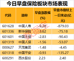 受中国人寿大跌的拖累,今日早盘保险板块市值缩水额超过了1500亿。除西水股份逆势上涨外,其余6只保险股早盘跌幅均超过了大盘,其中新华保险下跌3.62%,中国太保下跌2.83%,中国人保下跌1.56%。