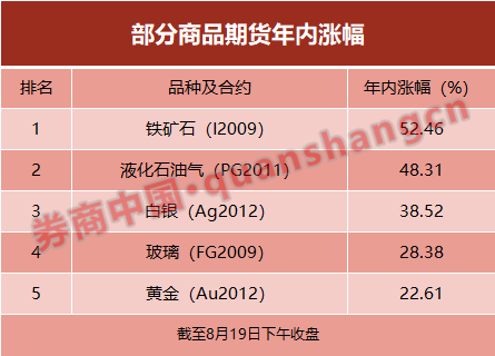 从年内涨幅看,铁矿石涨幅排名首位,涨幅超过50%。液化石油气紧随其后,主力合约年内涨幅为48.31%。白银年内涨幅接近40%,玻璃和黄金的涨幅也都超过了20%。