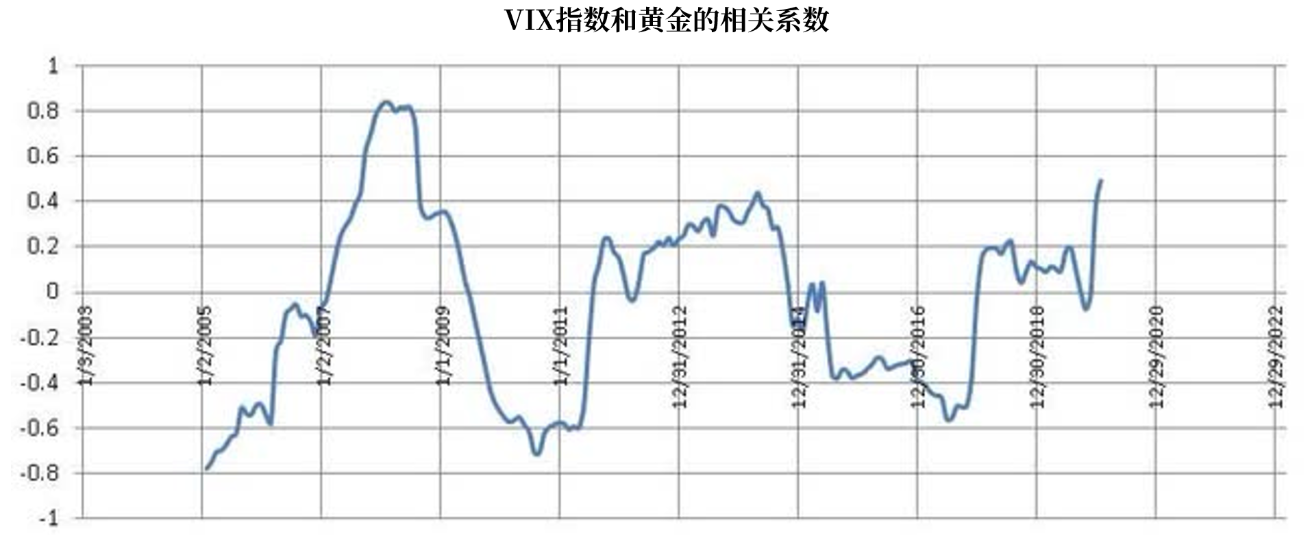 2014-2016年VIX指数和黄金基本上呈负相关,相关系数约在-0.6至-0.2之间,这段时间VIX指数对金价没有什么指导意义。但从2017年开始,二者的相关系数转为正值,约为+0.5。