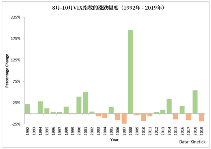 在过去的几十年中,VIX指数在8月-10月波动性会上升,有60%的概率上涨,平均上涨32%;有40%的概率会下跌,平均下跌10%。QuandaryFX表示,综合来看,VIX指数指数8月-10月之间的平均变动率为上涨14%。他认为,今年很可能也不会例外。
