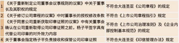 硬夺不行,杨子平此次选择通过董事会决议的方式欲直接废除原公章,并赋予其签字取代公章的权力。这也引发了大连圣亚大股东星海湾投资的两名董事梁爽、吴健及职工董事肖峰的反对。根据三名董事的表态,公司公章、证照一直处于安全、妥善保管状态,不存在任何人违反规定擅自使用或盗用的情形,故公司重新获取印章证照的理由不成立。