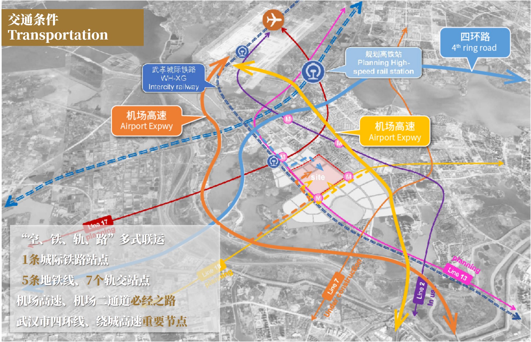 绿地控股认为,武汉绿地天河国际会展城聚焦会展新经济、空港交通枢纽、产业园新基建等关键领域。并且,该项目位于依托武汉天河机场发展的武汉黄陂临空经济区核心,距离天河机场仅5公里,轨道交通密集,包括5条地铁线的7个轨交站点,以及汉孝城轨盘龙城站和规划中的高铁站——天河北站,正在形成“机场+高铁+地铁+城铁”的最强空轨一体化TOD(以公共交通为导向的开发模式,transit-oriented development)国家级交通枢纽。