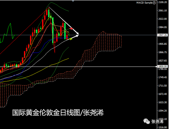 国际黄金技术上;周线级别;金价自上周触及10周线支撑展开反弹后,有较长的下影线,暗示走势有看涨延续。本周金价走势也延续信号又自走高至布林带上轨之外,但之后又展开大幅回撤,目前已跌至5周线支撑下方,整体看收取长上影线的看空信号较强。但根据一长下影线加一长上影线并列来看,预计后市也是走一个宽幅震荡,并将持续几周震荡缩减运行。那么区间上可关注上轨阻力与10周期线支撑而形成的空间来回盘整了。之后根据其力度逐渐缩减即可。当然,点位上也是在跟随变化缩减的。因而具体操作还是以张尧浠实时指导信息为主。上方初步阻力关注1960美元/盎司,下方支撑关注1925美元支撑。