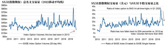 除了股息期货(其名义交易量通常比股票期货低0.5%),成交量季节性下跌幅度最大的当属SX5E指数期权,其20天成交量移动均值刚刚才达到2013年的水平。