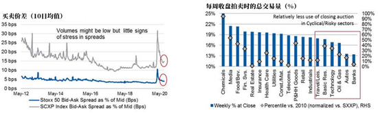 此外,大摩也指出,在2020年第一季度,现金股买卖价差创下了历史新高。SX5E股票平均价差最高时为12个基点,而小型股SCXP指数价差则高达32个基点。好消息是,现在两者价差分别为4个基点和15个基点,已经缩窄了约80%。大摩指出,这是现金资产正常化的迹象。