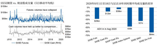 下面左侧的图表显示了SX5E期货与现金资产的对比。可以发现,期货成交量的下跌比现金更为明显。右图则展示了2020年8月1日至18日,与过去10年同时期平均成交量的差异。可以发现,今年现金成交量比其他产品表现相对更好。