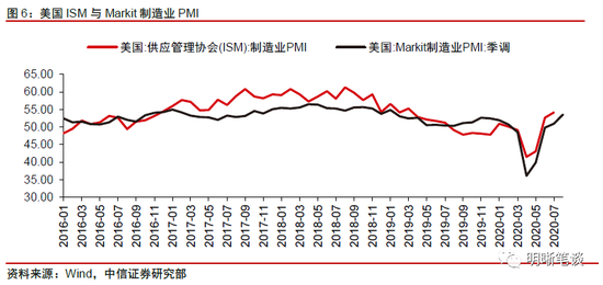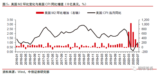 对于近期美国通胀好转的原因,我们认为主要源于美联储大规模宽松政策造成的货币供给增多和市场对美国经济复苏的预期有所提高。对于近期美国通胀出现好转,我们认为从原因上来看主要存在于以下两个方面。一方面,3月份以来美联储的大规模宽松政策使得美国货币供给大幅增加,而高增的货币供应量推动通胀上行。从美国M2存量的环比变化与美国CPI同比增速之间的关系来看,3月份开始随着美联储的大规模扩表和货币投放,美国M2存量快速增长,4月份单月美国M2增加约1.05万亿美元,货币供给的激增带动通胀水平的上涨。另一方面,市场对于美国经济复苏的预期有所提高。8月美国Markit制造业PMI初值为53.6,创下了2019年2月份以来的最高水平,从近几月美国官方和Markit制造业PMI数据的表现来看,当前美国经济景气程度正在疫情带来的剧烈冲击后逐渐恢复当中,市场对于美国经济复苏的预期也有所提高,这也在一定程度上推涨了美国的通胀水平。