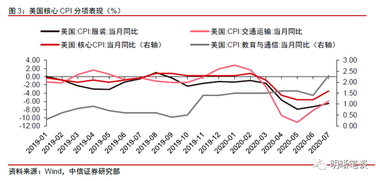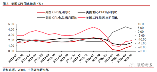 首先,对于美国通胀情况而言,7月美国通胀数据超出市场预期,核心CPI加速回升,通胀预期也处在持续恢复当中。7月美国CPI环比增速为0.6%,同比增速1%,核心CPI环比增速0.6%,同比增速1.6%,7月美国通胀数据超出市场预期。具体来看,7月美国CPI的同比上升,一方面源于核心CPI的上行支撑,另一方面6月份开始能源分项的同比增速回升也是支持美国CPI上行的因素。从核心CPI的分项表现情况来看,6月份开始服装和交通运输分项同比增速均有所抬升,这反映出了5月底美国将工作重心从防控疫情向经济重启转移的成果。另外教育与通信分项在7月份同比增速也出现了大幅回升,对核心CPI增速提供了有力支撑。根据美国10年期通胀指数国债(TIPS)反映出的美国通胀预期来看,在财政政策及货币政策的持续刺激下,当前美国通胀预期正在持续抬升,较3月的低位增加逾1%。
