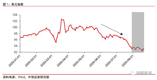 从当前美元指数的影响因素来看,我们认为随着美国经济的缓慢恢复和下半年风险事件带来的避险情绪,由货币宽松带来的美元下行或已阶段性调整到位,美元仍有一定的支撑。我们在上周的报告《债市启明系列20200818—影响美元走势的三大因素》当中对于当前美元指数的主要影响因素做出了分析并给出了我们的观点,对于年初以来美元指数的走势,我们认为当前影响美元指数的因素主要有三个方面,分别是货币政策、经济基本面和避险情绪,而美元的走势也是由三种因素共同作用的结果。对于美元走势而言,短期来看,我们认为由货币宽松带来的美元下行或已阶段性调整到位,年内在避险情绪逐渐加重和美国基本面缓慢恢复的背景下,美元仍有一定的支撑,短期对于美元不应过度看空。