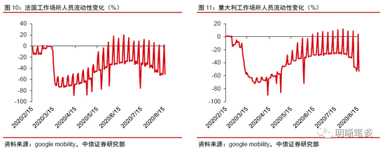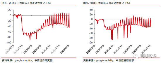 从谷歌公司给出的人员流动性观测数值来看,近期西班牙、德国、法国以及意大利等国工作场所人员流动性均有所下降,反映出疫情反弹对欧元区经济重启工作的影响。从谷歌公司提供的人员流动性观测数据来看,对于工作场所人员流动而言,近期欧元区国家如西班牙、德国、法国以及意大利等国,我们均能够从曲线当中看出工作场所人员流动在经历了一段时间的好转以后,近期又出现了明显的下滑,这也反映出当前在欧元区疫情反弹的背景下,欧元区复工复产工作受到了一定的影响。