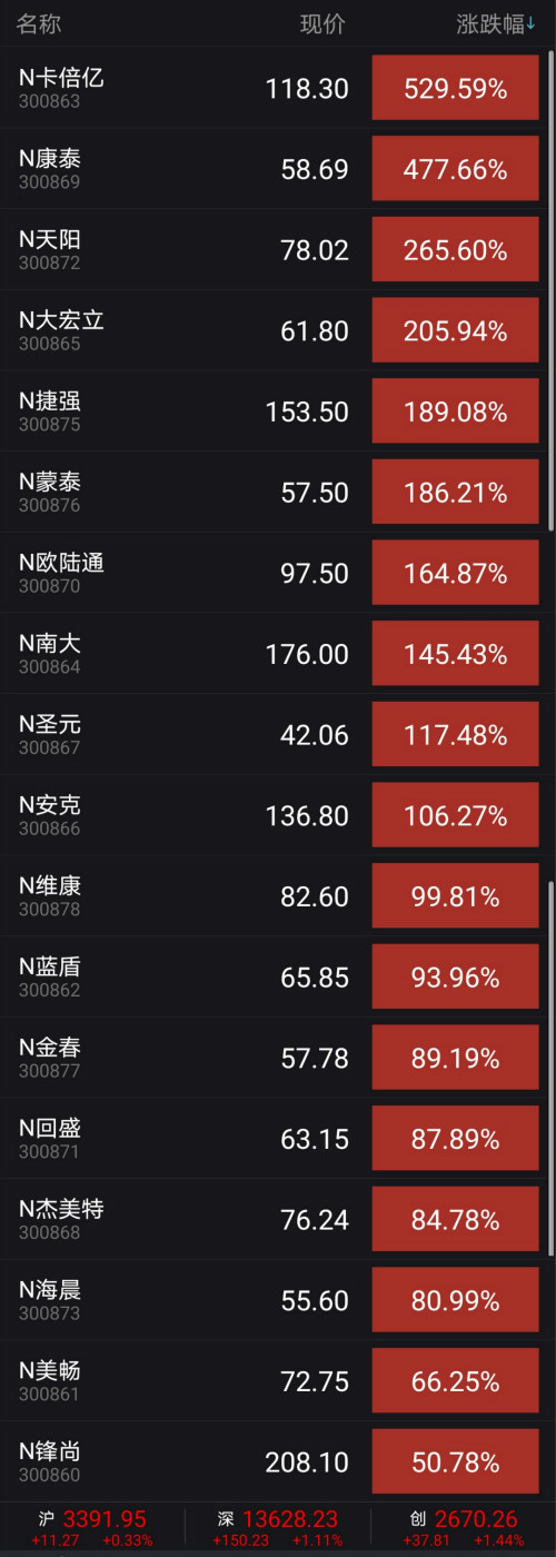 截至上午10时35分,首批18家发行企业上市首日股价集体大涨,涨幅均超50%。其中,N卡倍亿(300863.SZ)以高达529%的涨幅领涨,N锋尚(300860)涨幅居末,涨幅为50.78%。此外,N康泰(300869.SZ)涨477%,N天阳(300872.SZ)、N大宏立(300865)均涨超200%。N捷强(300875.SZ)、N蒙泰(300876.SZ)等6股涨幅均超100%。
