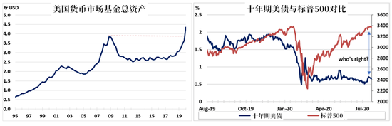 左图显示,美国货币市场基金总资产从2018年一季度的2.8万亿美元飙升到2020年一季度的4.3万亿美元,创历史新高。右图显示尽管股价反弹,但十年期美债收益率依旧维持在65个基点的超低水平处,说明资金仍在涌入债市避险。