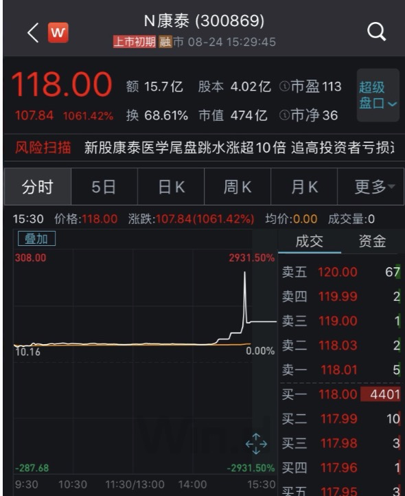在接下来2分钟时间内,康泰医学股价又跌到118元并收盘,涨幅缩小到1061%,全天换手近69%,成交15.7亿元,总市值为474亿元。