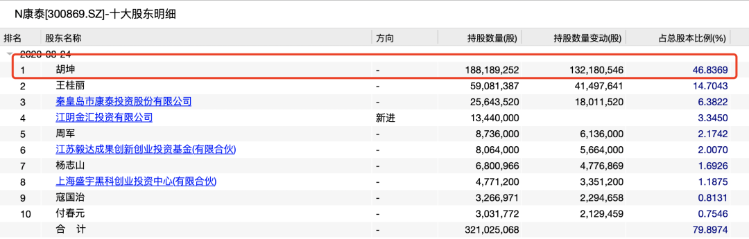 值得一提的是,身兼董事长、实控人和第一大股东的胡坤持股比例较高,其个人便直接持有康泰医学46.84%的股份。