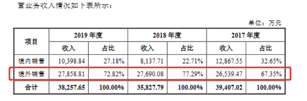 财务数据显示,康泰医学2017年-2019年营业收入在3.7亿元左右,分别是3.98亿元、3.62亿元和3.87亿元;对应的净利润为7705.72万元、6203.10万元和7378.12万元。近三年来,康泰医学境外销售收入持续增长,并占主营业务收入的绝大部分,所占比例分别是67.35%、77.29%及72.82%。
