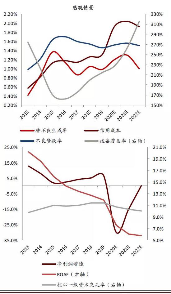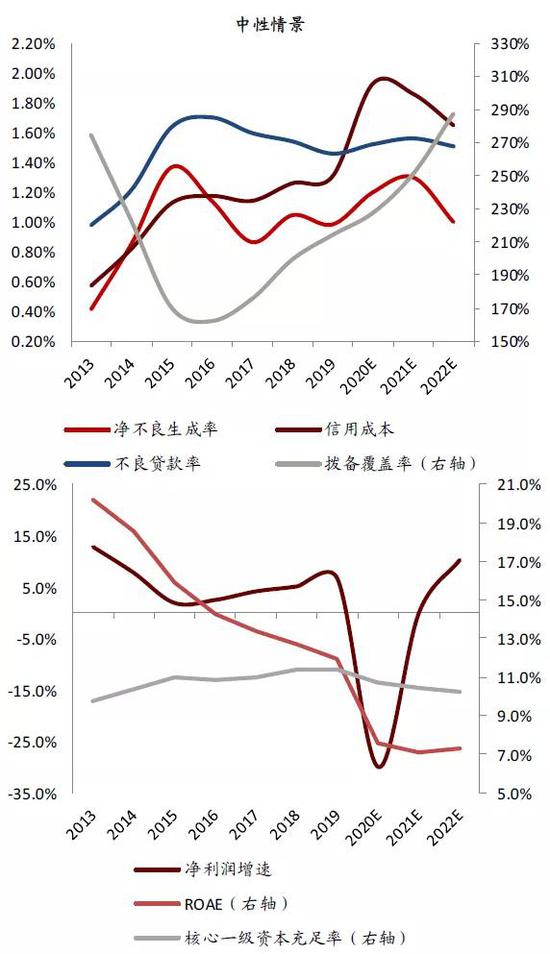 我们以信用成本作为因变量,拨备覆盖率、利润增长、ROE对应变化,测算分为乐观/中性/悲观三种情景。其中,中性和悲观情景下,小部分上市银行ROE下滑明显,资本补充可能被业绩表现拖累。基于以上信用成本参数,2021/2022年上市银行拨备覆盖率接近甚至超过2012年上市银行历史峰值。考虑到2020年较高的计提拨备和2022年同比下降的净不良生成率,2021年计提拨备(或信用成本)应较假设数值明显下调。因此,2021年业绩负增长是小概率事件。