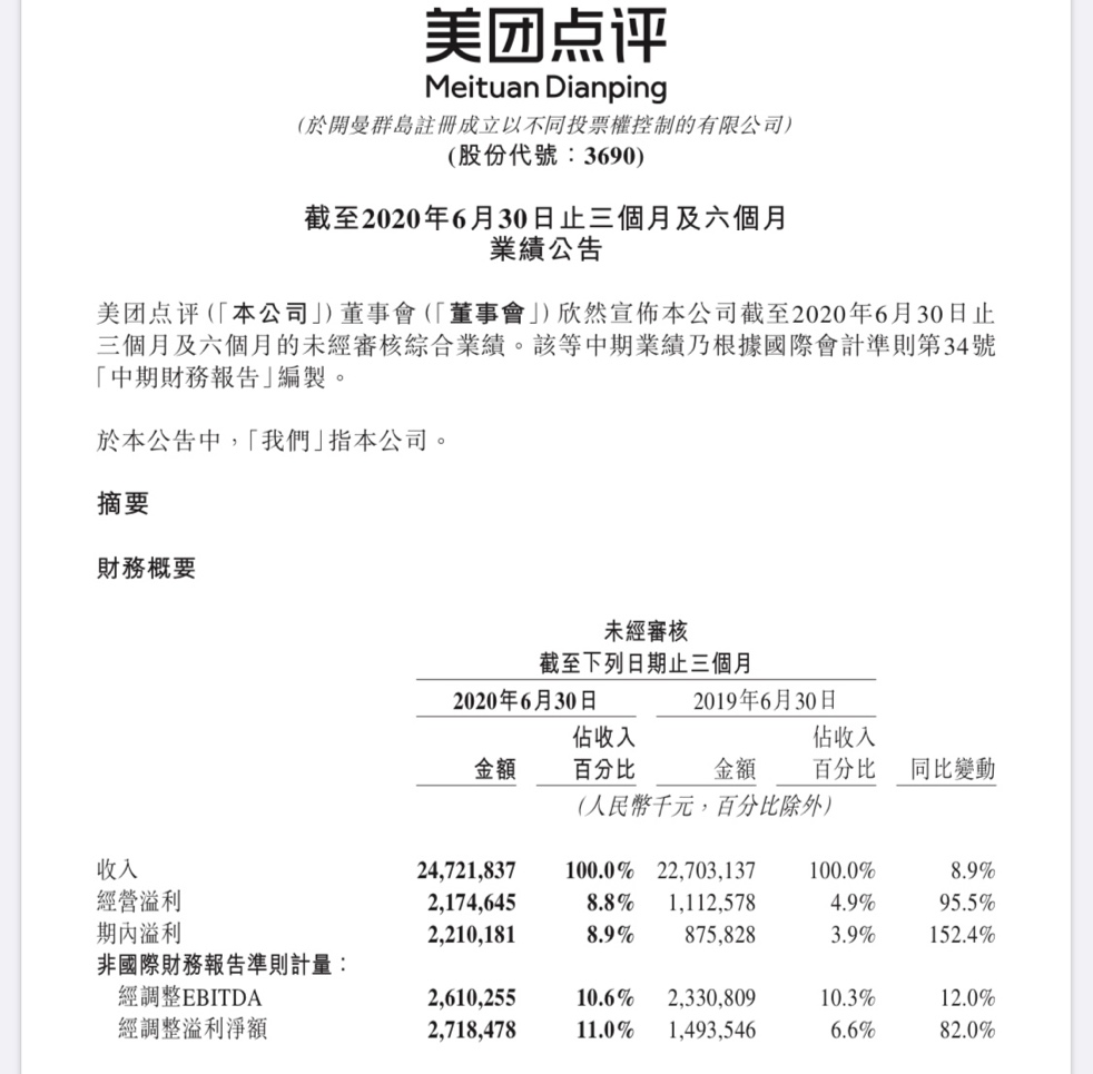 截至2020年Q2,美团总营收247.2亿元,同比增长8.9%。高于市场预期的235.82亿元;净利润为22.1亿元,同比增长152.4%。受到疫情影响,到店、酒店及旅游业务收入同比下降13.4% 达到45.4亿元。但其他业务均实现增长:餐饮外卖收入达到145.4亿元,同比增长13.2%。新业务及其他收入达到56.3亿元,同比增长22.1%。