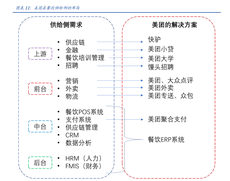 美团利用自身在下游的积累、技术优势、对行业的理解,带动上游供给侧改革。在服务B端客户方面,美团快驴提供从筹建到运营、从前台到后台的供给端解决方案。