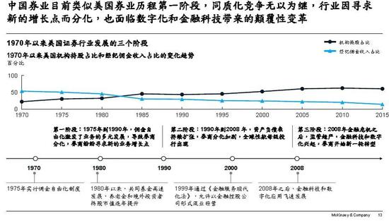 结合美国近五十年来券商业务发展的变迁,其先后经历了佣金自由化、混业经营、金融科技和数字化等不同阶段的变迁。中国相较于美国的发展历史,我们将进入市场化竞争+科技化叠加的阶段,券商竞争将更为激烈,但运用科技赋能的空间可能也非常大。