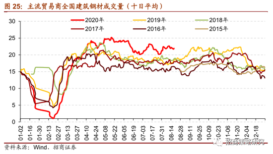 近期建筑钢材成交量保持回暖态势。根据Mysteel Data,从过去十日移动均值情况来看,全国建筑钢材成交量维持7月末以来的回暖态势,截至8月25日,主流贸易商全国建筑钢材成交量十日均值为21.3万吨,继续高于过去几年同期水平。
