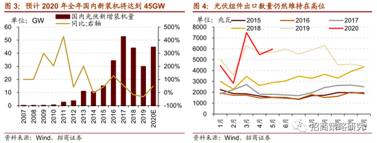 下半年国内光伏装机规模明显扩张,海外需求具备较强保障性。根据国家能源局发布的的数据,上半年国内光伏新增装机容量为1152万千瓦,与去年同期相比保持微弱正增长,基本符合市场预期。8月5日发改委公布2020发布光伏发电平价上网项目的通知,将平价光伏发电项目3305.06万千瓦纳入2020年光伏发电平价上网项目清单,下半年光伏装机规模依然有较大的空间,尤其是四季度将会是光伏装机旺季。另外,在国内外疫情干扰下,上半年光伏出口数量出现负增长;随着疫情逐渐得到控制以及海外复工复产的推进,5月光伏出口数量已经恢复至正增长,预计海外部分的需求可能会推迟至三季度甚至四季度释放,因此光伏出口正处于恢复之中且下半年具有较强的保障性。