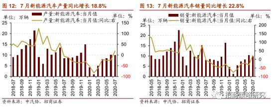 根据中汽协发布的数据,2020年7月份国内新能源市场产销均有较大幅度上行。2020年7月我国新能源汽车当月产量为100000辆,同比增长18.8%;销量为98000辆,同比增长22.8%;产销量当月同比均为去年7月以来首次转正。与此同时,欧洲新能源汽车市场销量也出现明显反弹,如7月德国和法国新能源汽车销量同比实现翻倍增长;由于欧洲多个国家采用了补贴、降税以及新增充电桩等措施来刺激新能源车市场,预计欧洲新能源车市场将会继续保持反弹趋势。