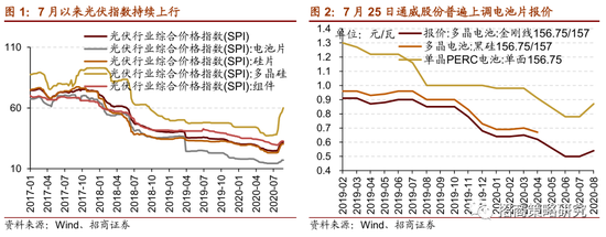 7月左右光伏产业链价格出现全面上涨,其中硅料由于供给端紧缺而出现快速涨价。2018年光伏政策收紧(531新政)后补贴退坡导致企业产能扩张步伐放缓,行业补贴逐渐退坡以及平价上网的推进使得产业链价格中枢整体出现下移,产业链价格指数一直处于震荡下行的状态。根据Solarzoom公布的数据,2020年6月中下旬以来光伏行业多晶硅价格指数出现企稳回升,进入7月以后加速回暖且涨价趋势传导至硅片、电池片环节。7月25日,光伏龙头企业通威股份上调电池片价格,其中双面156.75单晶PERC电池片价格上调11.54%,双面158.75单晶PERC电池片价格上调11.25%;7月31日,光伏龙头企业之一隆基股份上调硅片价格,G1/M6单晶硅片价格涨幅分别达到10.3%/11%,这是该企业在7月24日之后的第二次提价。