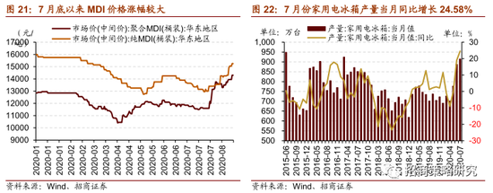 另一方面,MDI下游行业复工带动行业需求回暖。其下游最大的需求领域集中在家用冰箱,7月冰箱产量同比增速已经恢复至20%以上;第二大需求则是房地产板块,目前商品房新开工和竣工面积正处于回暖中。下游持续复苏将持续增加对于MDI的需求量,同时供给端产能收缩进一步推动价格加速上行。