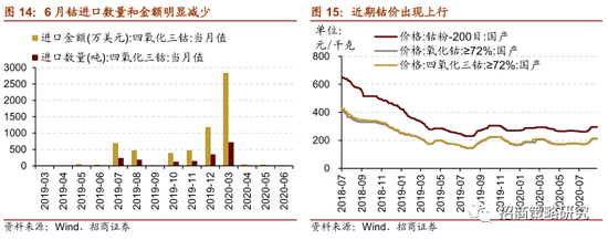 6月我国钴原料进口出现明显收缩,供给短缺背景下钴价出现上行。我国钴资源相对短缺,因此钴的对外依存度较高,其中刚果钴矿是我国钴进口的重要来源。根据惠誉报导,“预计2020年,刚果(金)钴产量将同比下降25%,主要是由于嘉能可的Mutanda矿的空运转,同时新冠疫情也导致采矿活动难度增加,还将在短期内限制刚果(金)钴行业产能扩张的速度。2019年刚果钴产量占全球的71.4%。惠誉预计需求将增加,主要是因为电动汽车的镍锰钴(NMC)电池需求量增加”。另外,有消息称因自身经济发展和战略需求,国内收储机构或将在今年年底前收储2000吨钴,这一消息也在一定程度上刺激了钴价快速走高。