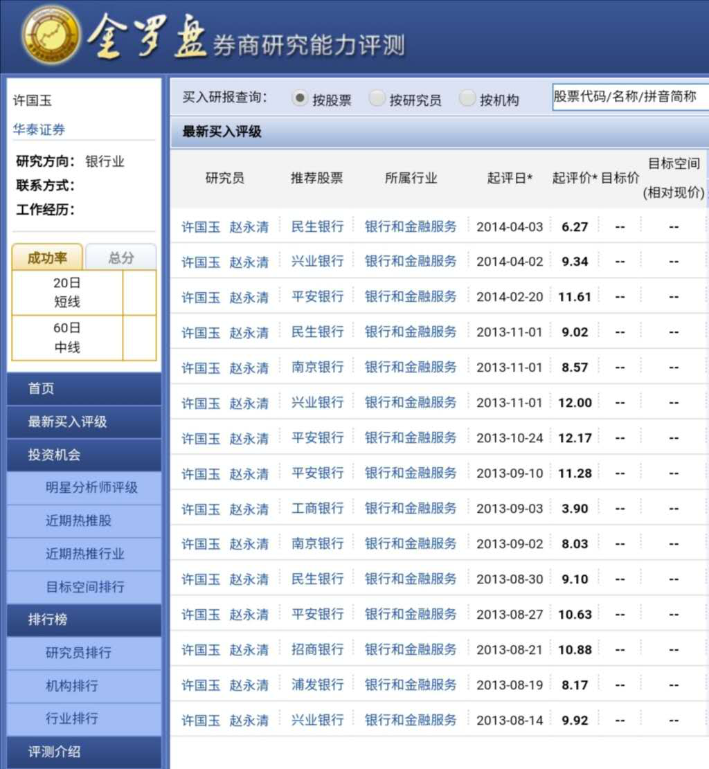 公开资料显示,最早在2012年,许国玉已有关于银行业的研究报告发布。金罗盘券商研究能力评测官网显示,在2013年8月到2014年4月之间,任职华泰证券研究所银行和金融服务行业研究员的许国玉发表了多篇研报,推荐了兴业银行、浦发银行、招商银行、平安银行、民生银行、南京银行、工商银行等。