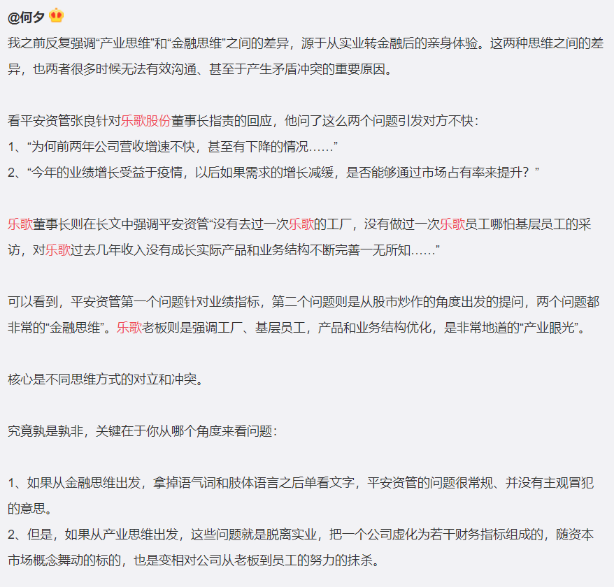 8月30日,事件中的另一方——平安资管股票投资经理张良就此回应称,前一天曾进行现场调研,不存在所谓的“没有来过乐歌一次调研”。他同时表示,在8月29日的线上调研中,听了董秘15分钟的介绍和董事长半个小时的介绍,“我们只在最后几分钟有机会,问了两个问题。”