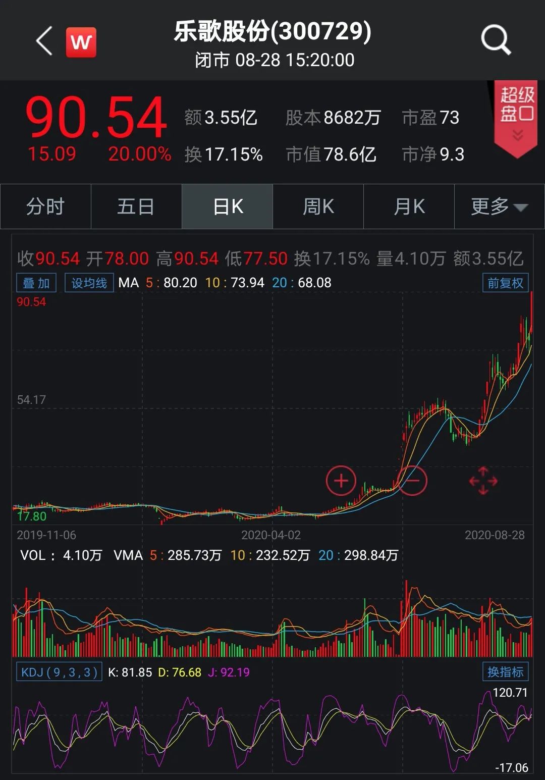 乐歌股份股价从5月份正式发动,经过4个月的连续上涨,股价从20元附近涨至90元上方,涨幅接近340%。而8月份,乐歌股价上涨再度加速,先后录得5个涨停板,8月28日更是收获创业板改革后的首个20%涨停,整个8月累计涨幅高达79.18%。