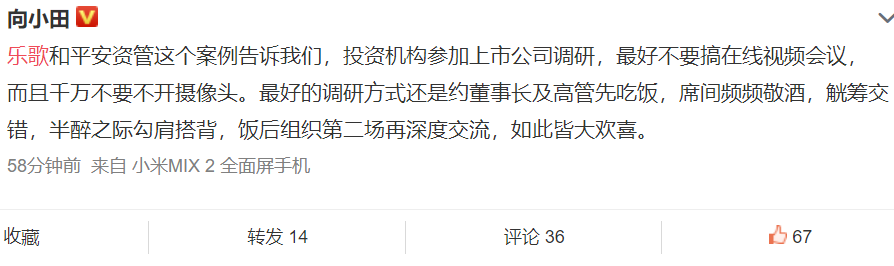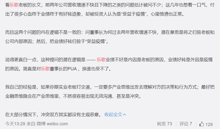 文章最后项乐宏表示,视频会议人文要素不足,容易造成误解;本次事件应被理解为偶发事件,希望今后来公司调研的人员事先准备。