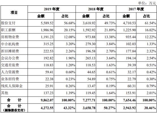 2017年至2019年,青云科技的管理费用分别为7654.46万元、7277.71万元、9862.07万元,剔除股份支付后分别为2943.92万元、3658.78万元、4272.55万元。