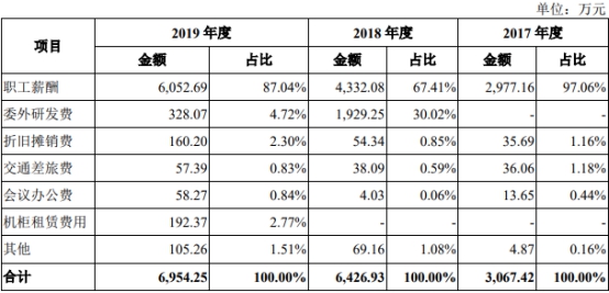 2017年、2018年及2019年,青云科技的研发费用分别为3067.42万元、6426.93万元和6954.25万元,主要为研发人员职工薪酬及委外研发费用等。