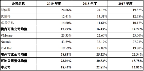 2017年至2019年,青云科技的研发费用率分别为12.82%、22.81%、18.45%,可比公司整体均值分别为18.78%、20.82%、23.06%。