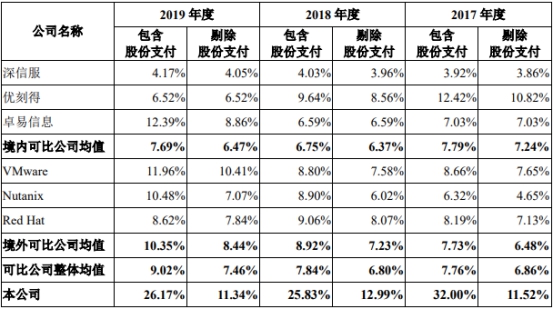 剔除股份支付后,青云科技的管理费用率仍高于可比公司,2017年至2019年分别为11.52%、12.99%、11.34%,可比公司整体均值分别为6.86%、6.80%、7.46%。