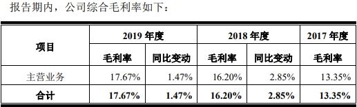 2015年至2019年,华安鑫创综合业务毛利率分别为13.30%、13.76%、13.35%、16.20%和17.67%。