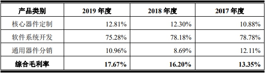 按产品分类来看,2015年至2019年,华安鑫创核心器件定制的毛利率分别为12.72%、11.53%、10.88%、12.30%和12.81%;软件系统开发的毛利率分别为19.99%、85.27%、78.78%、78.18%和75.28%;通用器件分销的毛利率分别为14.15%、15.67%、12.11%、8.69%和10.96%。