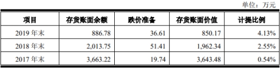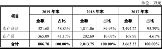 2015年至2019年,该公司库存商品分别为727.49万元、1077.55万元、3494.22万元、1811.06万元和521.68万元,占存货余额的比例分别为72.02%、87.48%、95.39%、89.93%和58.83%;在产品分别为0元、23.69万元、168.99万元、202.69万元和365.09万元,占存货余额的比例分别为0%、1.92%、4.61%、10.07%和41.17%;发出商品分别为282.66万元、130.49万元、0元、0元、0元,占存货余额的比例分别为27.98%、10.59%、0%、0%、0%。