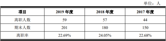 该公司在招股说明书中披露了2016年至2019年4年中的员工离职情况,离职人数分别为30人、44人、57人和59人,离职率分别为21.43%、22.68%、24.05%和22.69%。