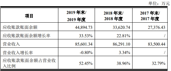 2015年至2019年,华安鑫创应收账款余额分别为7768.84万元、1.95亿元、2.74亿元、3.36亿元和4.49亿元,占各期营业收入的比例分别为18.57%、33.53%、32.79%、38.96%和52.45%。